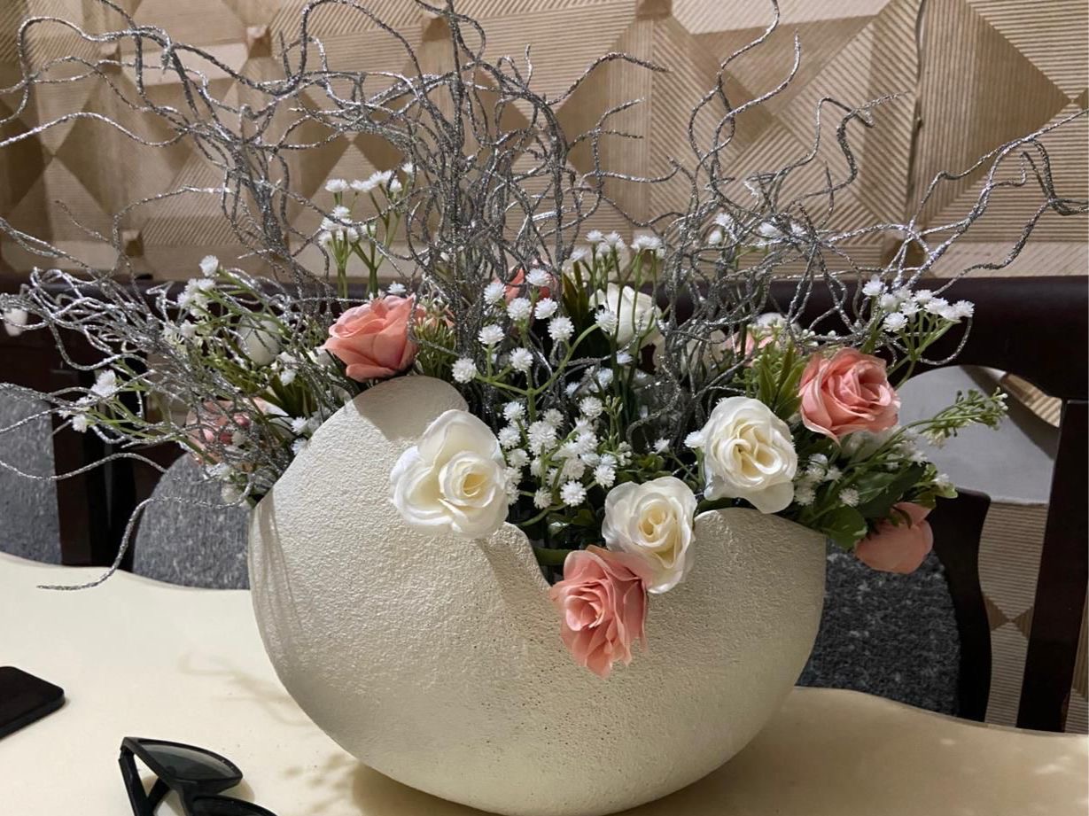 The Blush Elegance Flower Vase is a masterpiece of style and grace, designed to enhance your living space with a touch of luxury. Featuring lifelike artificial roses in shades of soft pink and classic white, accented with delicate baby’s breath and shimmering silver twigs, this arrangement sits in a uniquely crafted cracked-egg style vase with a textured finish.