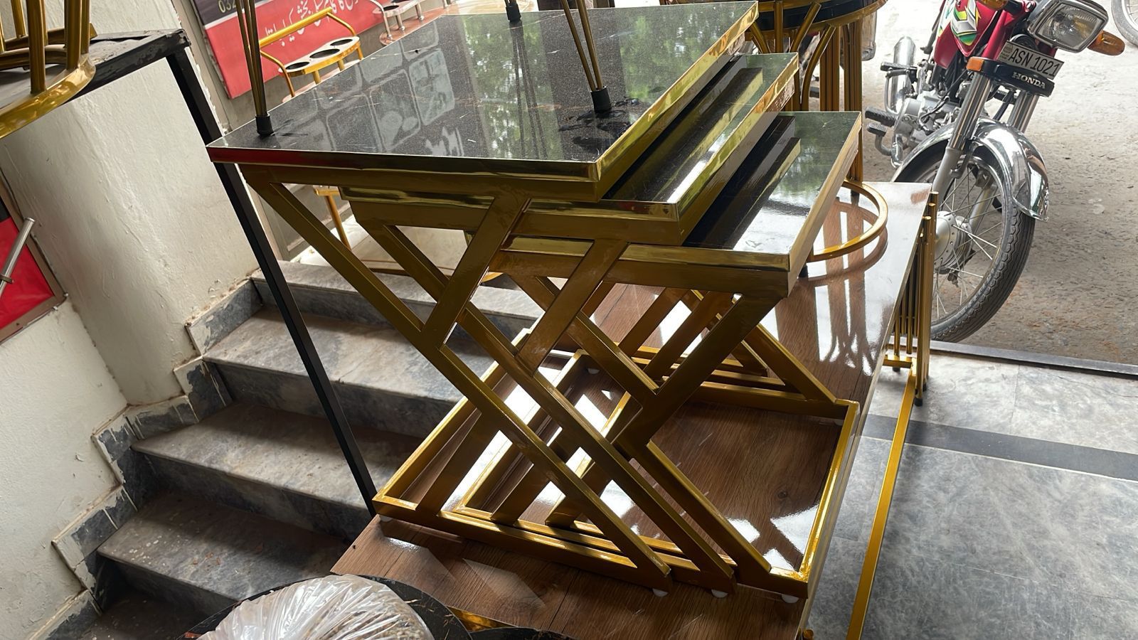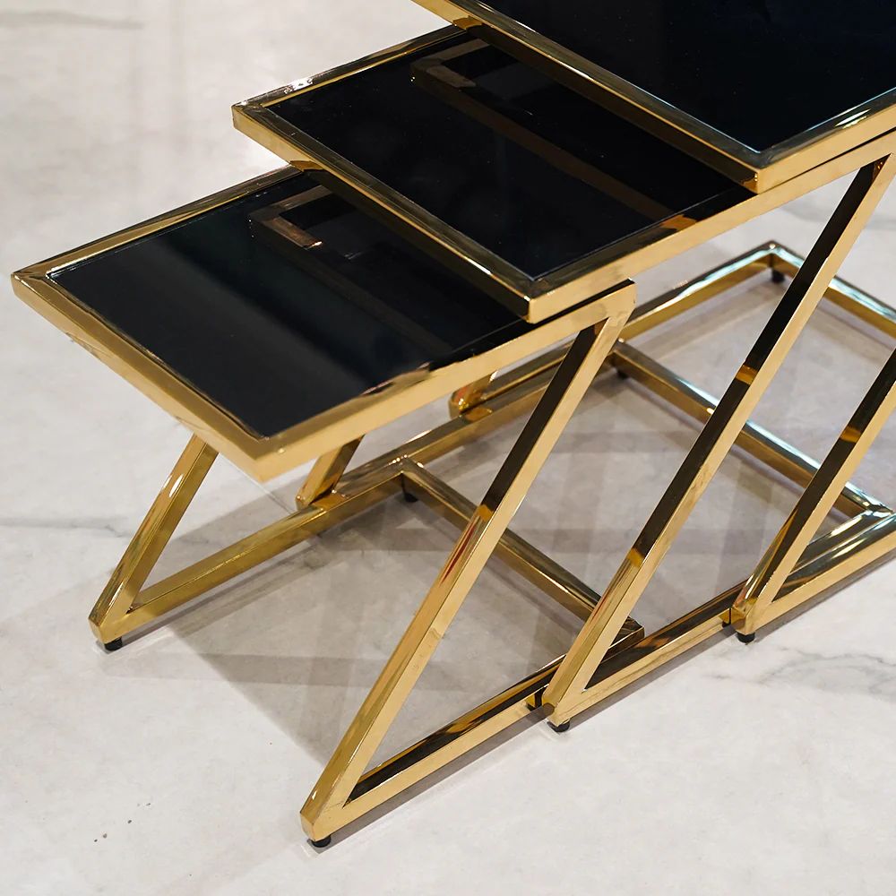 This elegant 3-piece nesting table set combines modern sophistication with luxurious materials. The sleek black marble tops are accented with delicate white veining, offering a refined touch to your decor. The gold-tone geometric frames create a bold contrast, providing a contemporary and stylish aesthetic. This set is versatile, with each table fitting neatly into the other for space-saving convenience. Perfect for adding a touch of luxury to any room, from the living room to the bedroom, these tables are functional as well as decorative.