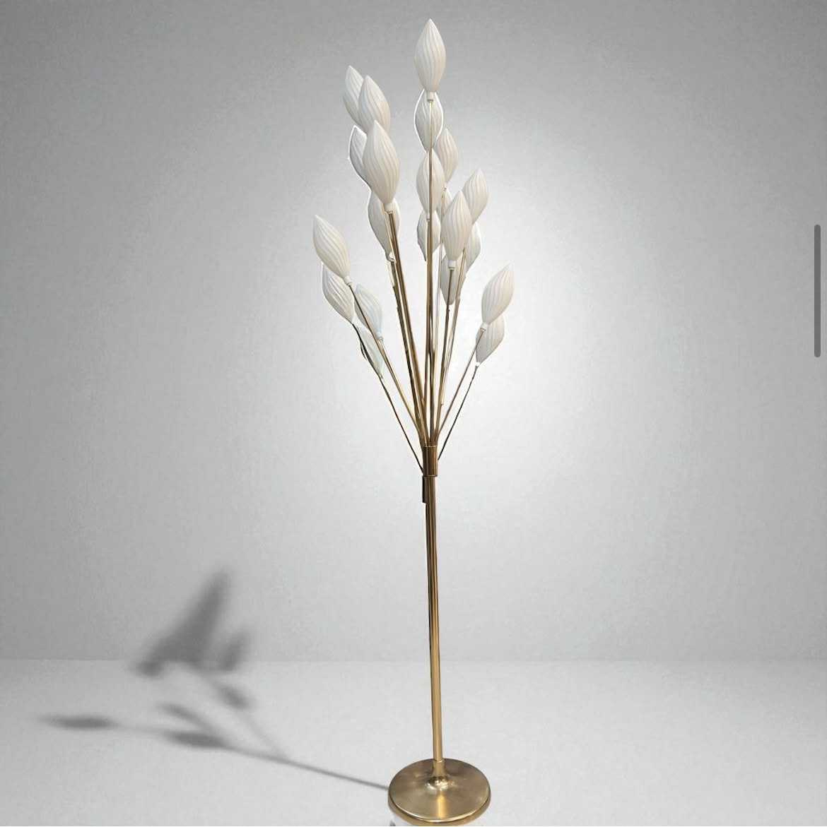 Introduce timeless elegance into your home with the Golden Leaf Cluster Floor Lamp. Standing at 4.5 feet, this lamp features a sleek golden base with multiple slender stems, each crowned with delicately designed white leaf-shaped shades. Its unique arrangement creates the look of a blossoming cluster, adding both charm and sophistication to any room.