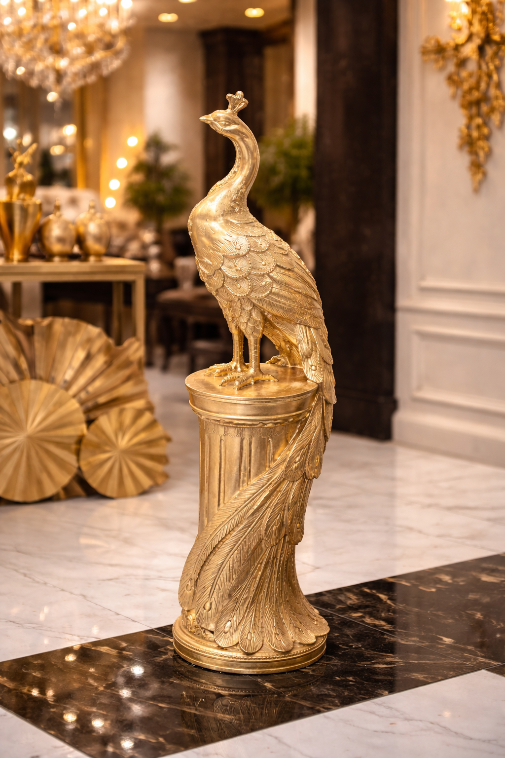 The statue features a majestic peacock perched elegantly atop a classic fluted Roman-style pedestal. The craftsmanship highlights intricate detailing, from the delicate layering of the neck feathers to the sweeping, dramatic curve of the tail feathers that flow gracefully down the base.