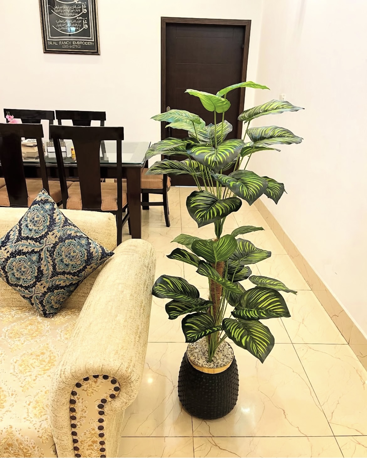 This sophisticated decorative indoor plant is designed to add height, greenery, and visual interest to your interior space. Featuring broad, lush green leaves with striking light-green vein patterns, the plant creates a realistic and refreshing natural appearance. Its vertical structure makes it ideal for filling empty corners or complementing furniture layouts without occupying too much floor space.