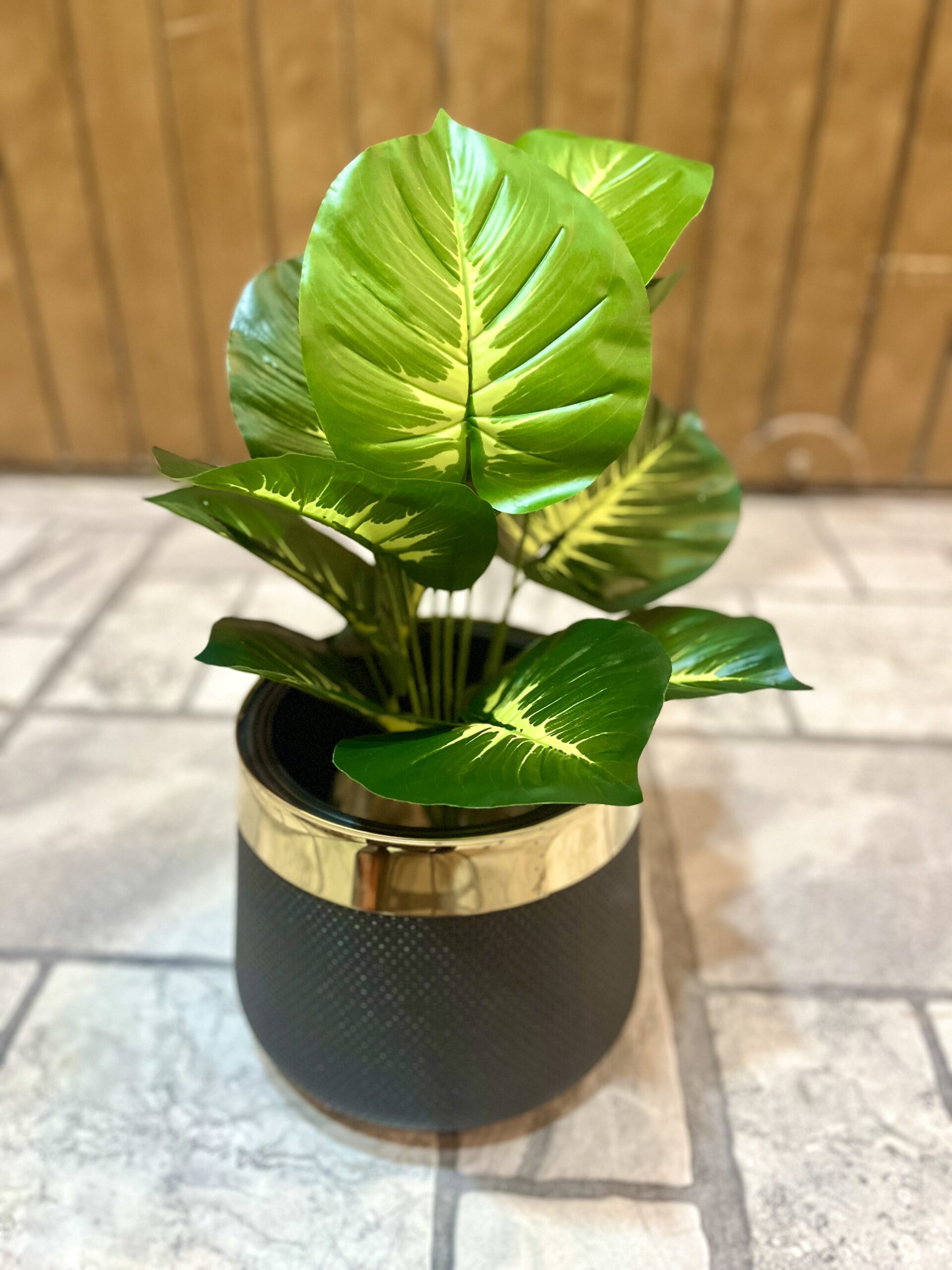 This artificial potted plant features rich, lifelike green leaves that bring a refreshing touch of nature indoors. The plant is housed in a sleek, modern pot that blends black and gold accents, offering a stylish and sophisticated look. Ideal for adding greenery to your home or office, this low-maintenance plant requires no watering or sunlight, making it a perfect choice for any room. The realistic design and durable materials ensure that it remains a beautiful centerpiece for years to come.