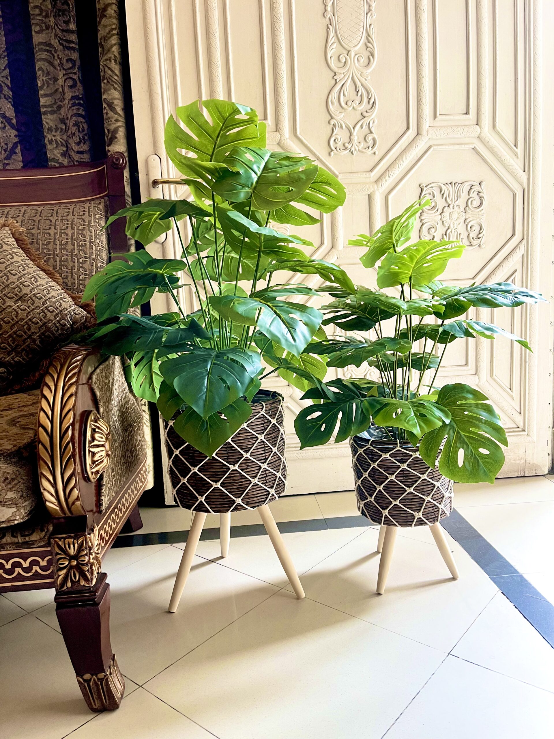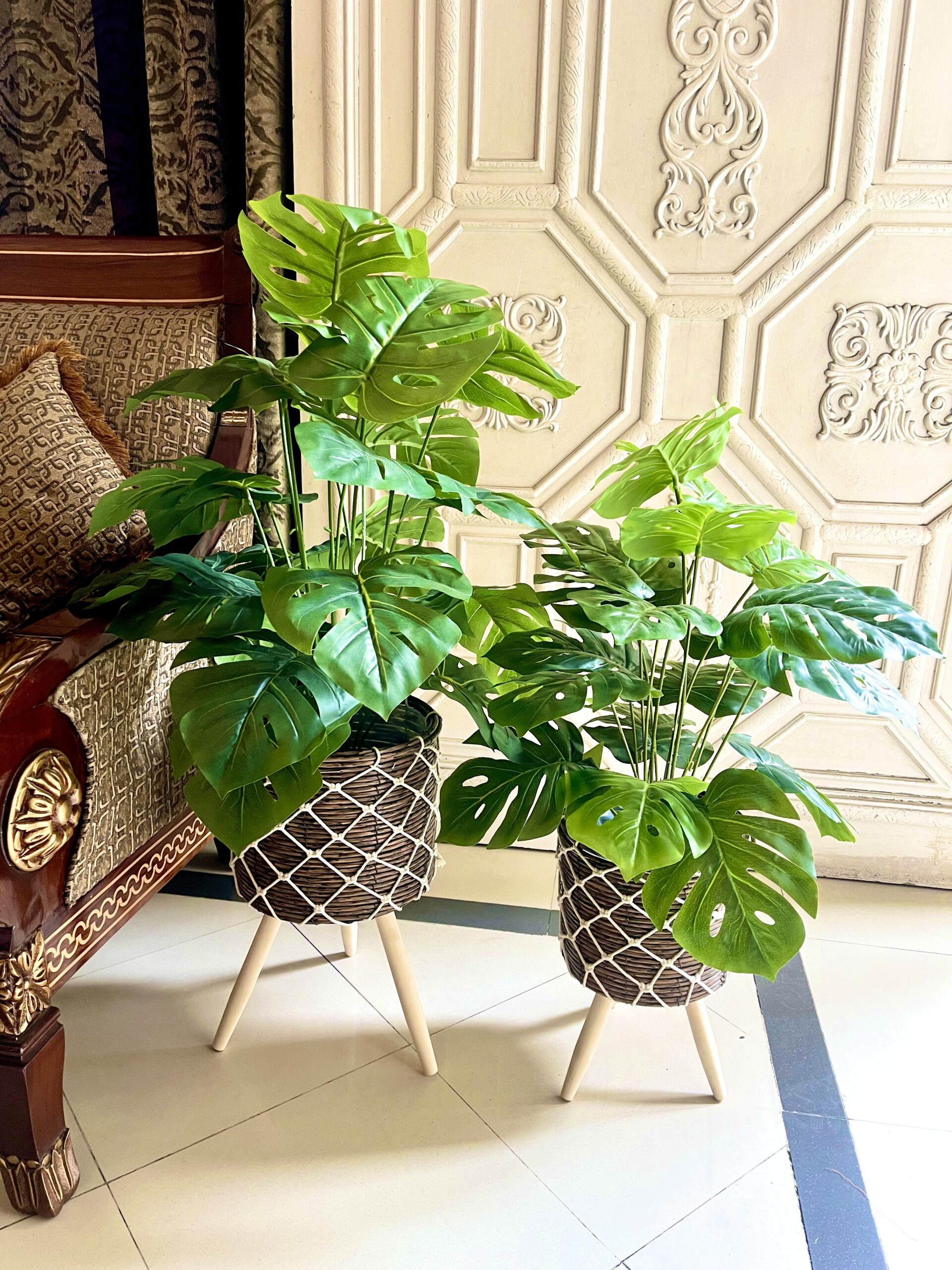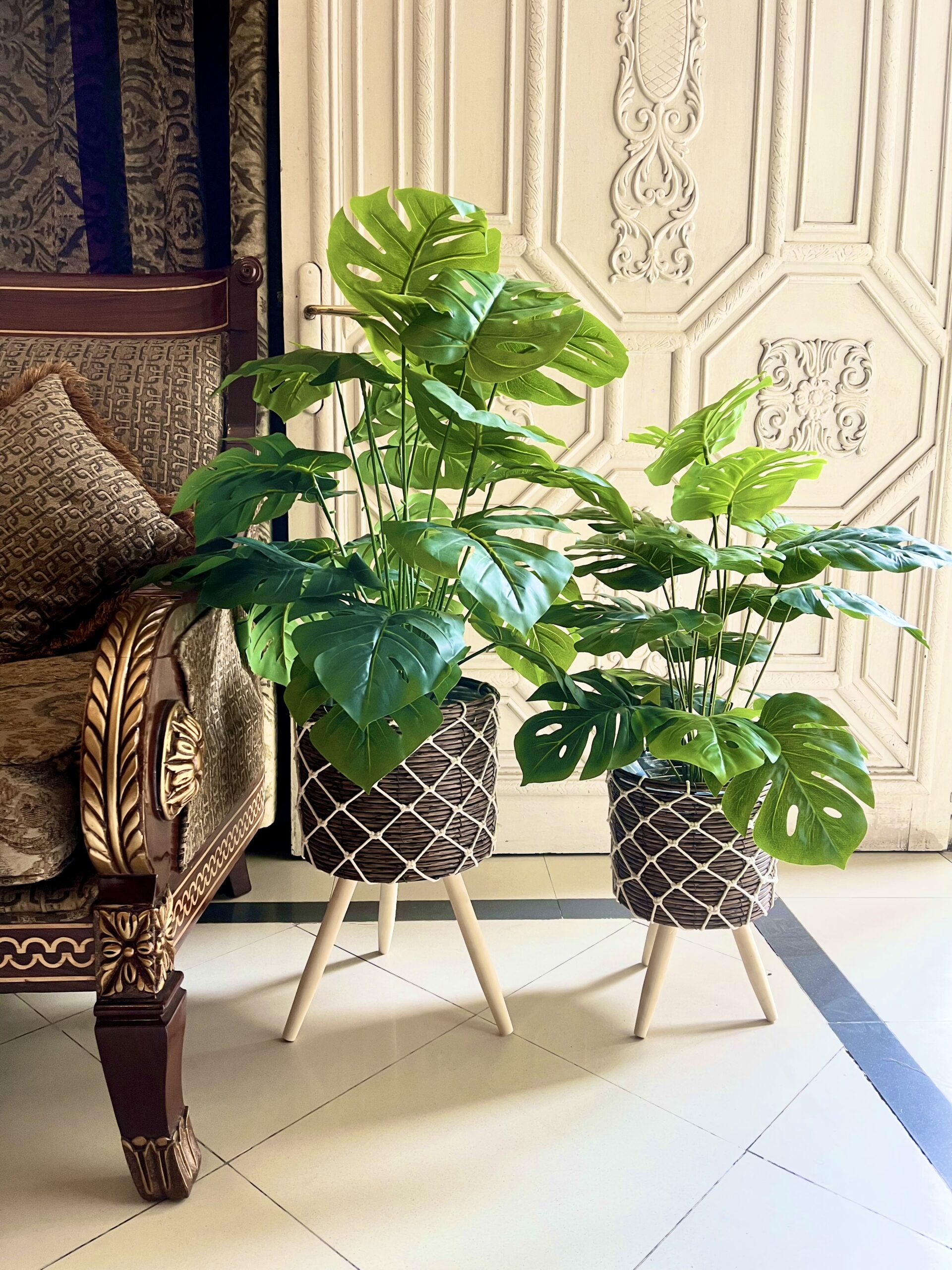This elegant pair of Monstera plants brings a refreshing, natural touch to your living space. Each plant stands around 4 feet tall and is housed in a beautifully crafted woven basket with light wooden tripod legs. The large, glossy green leaves of the Monstera create a vibrant atmosphere, perfect for brightening up your home or office. The baskets offer a stylish, modern touch, complementing the plants’ lush appearance while providing a sturdy base. Ideal for enhancing the ambiance of any room, these Monstera plants are a perfect choice for anyone looking to bring the beauty of nature indoors with minimal maintenance.