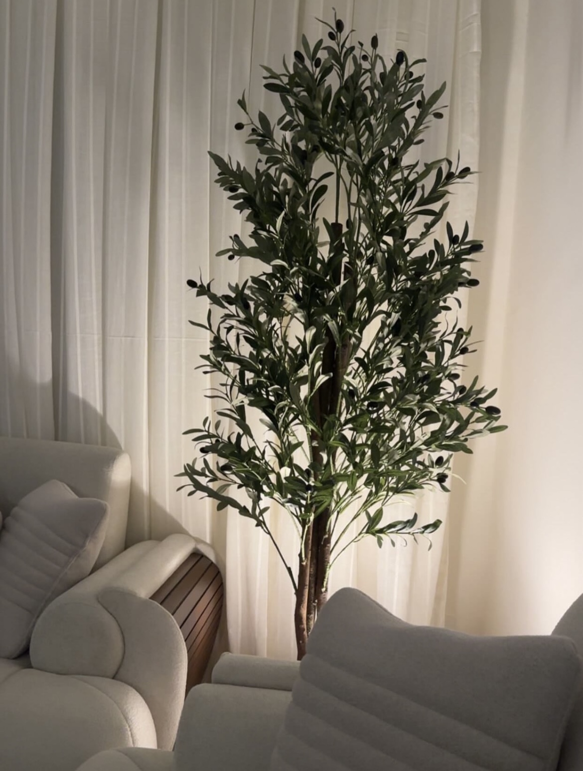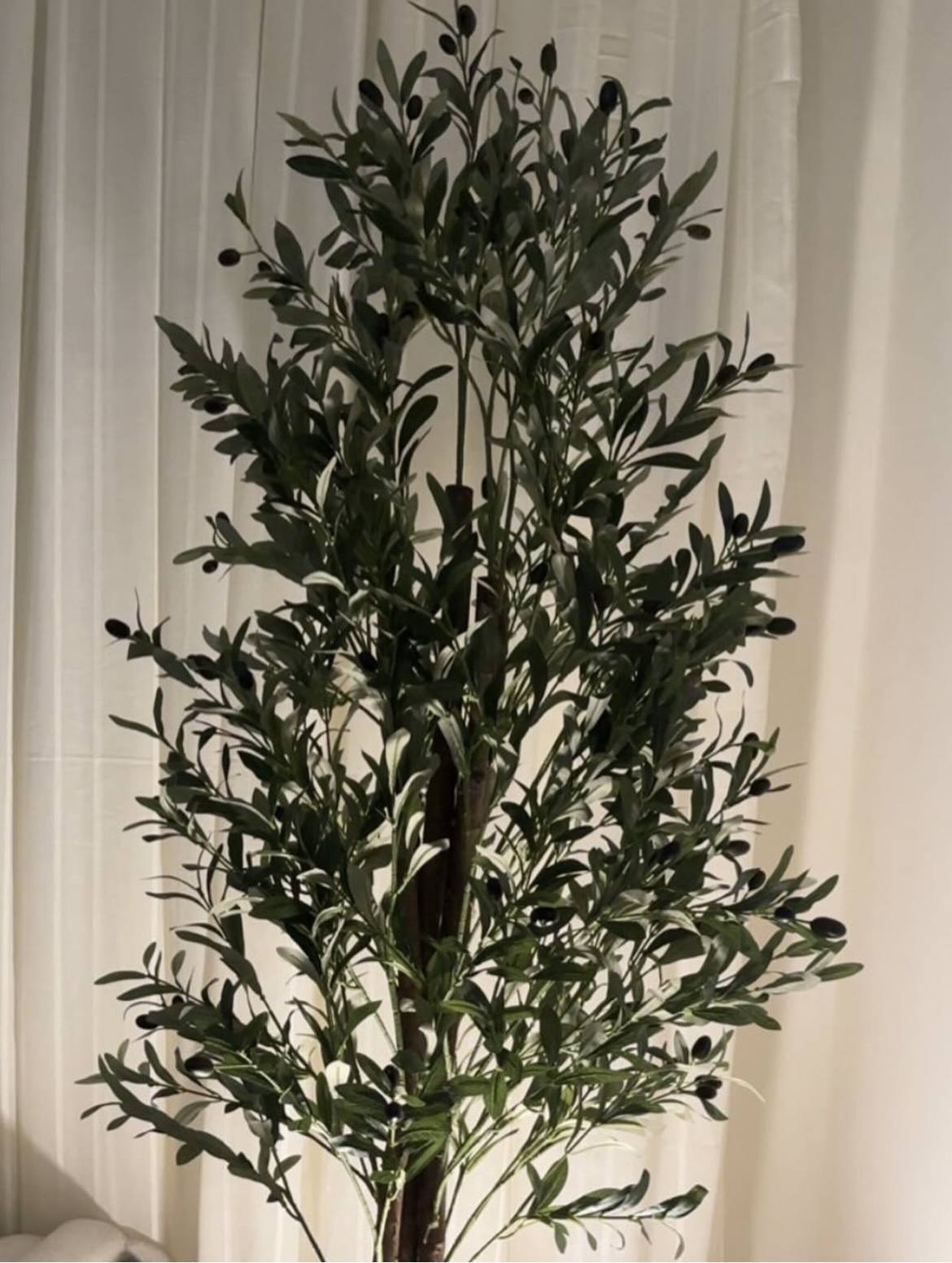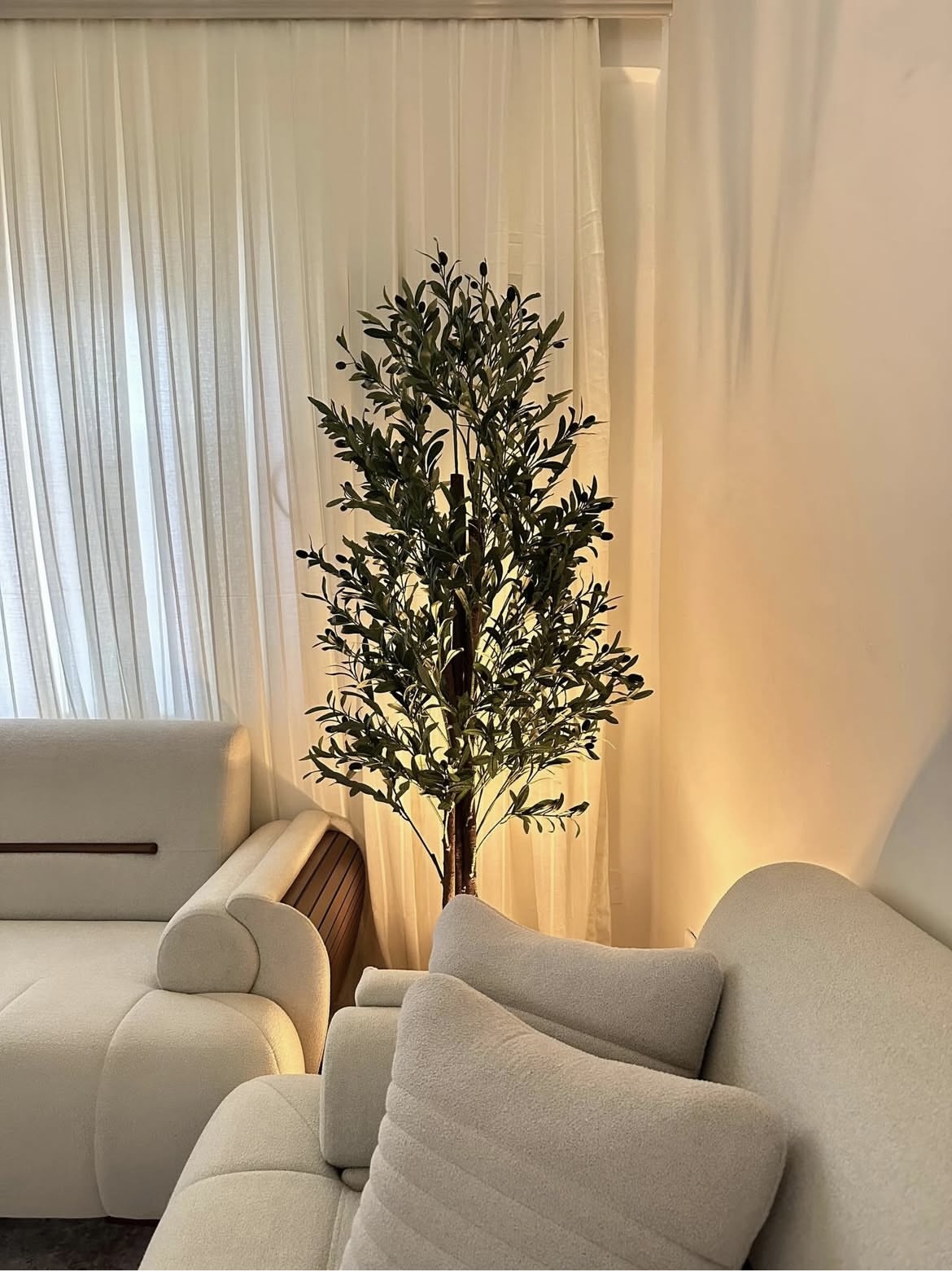 Bring the timeless elegance of the Mediterranean indoors with this beautifully crafted, lifelike faux olive tree. Standing tall with a sophisticated profile, it features an abundance of realistic, sage-green leaves with silvery undersides that catch the ambient light. Scattered throughout the dense foliage are small, dark purple-black olives, enhancing its authentic appearance. The plant is supported by a textured, multi-stemmed trunk that mimics natural wood. Shown here nestled between sofas and backlit by warm light, this maintenance-free botanical is the perfect statement piece to add tranquility and organic beauty to a modern living space.
