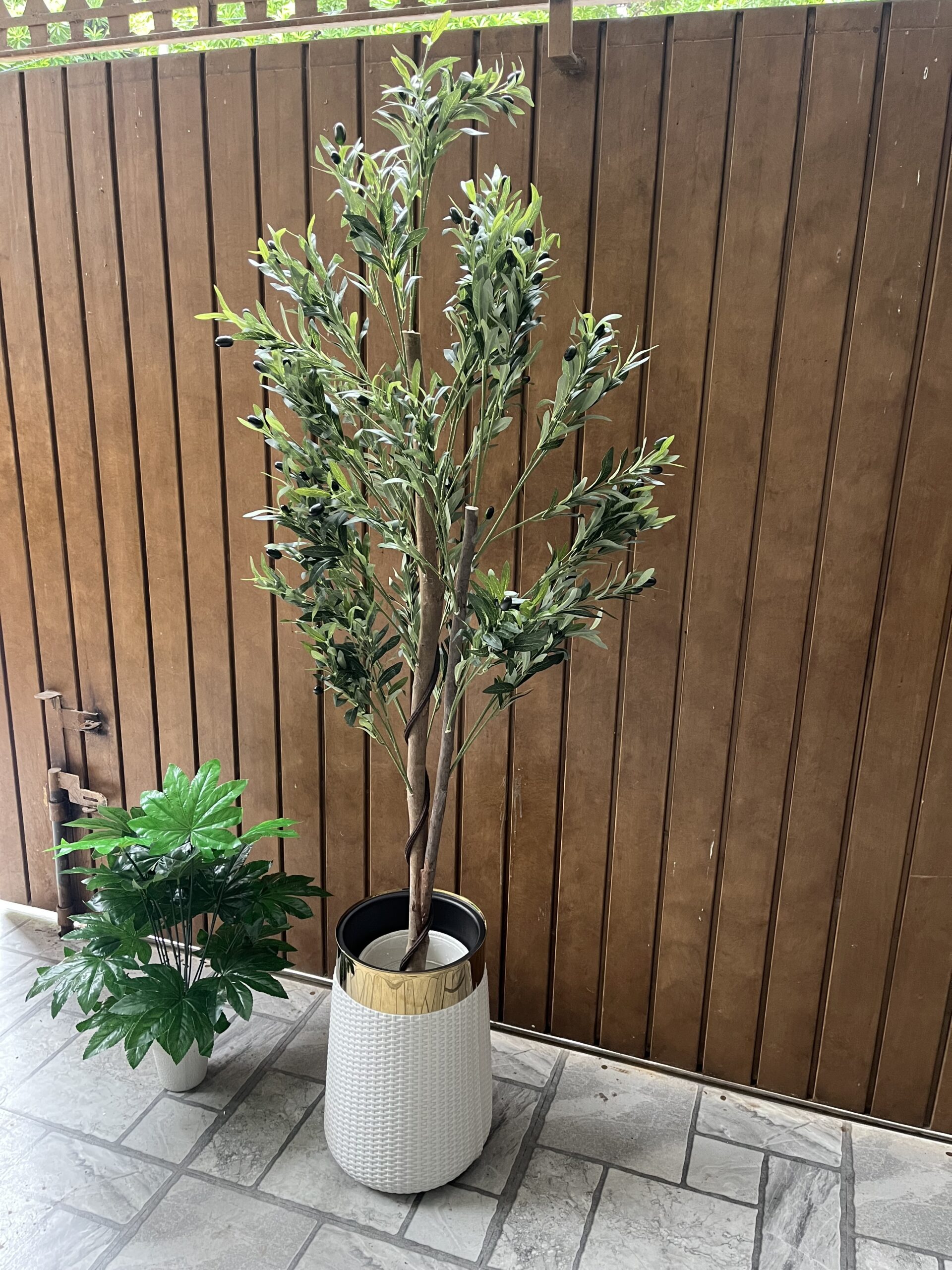 The planter, crafted from durable plastic with a sleek white woven design and golden rim, enhances the overall elegance, making it suitable for living rooms, patios, balconies, or entryways. Lightweight yet sturdy, this combination is easy to move and maintain, offering the beauty of greenery without the hassle of care.
