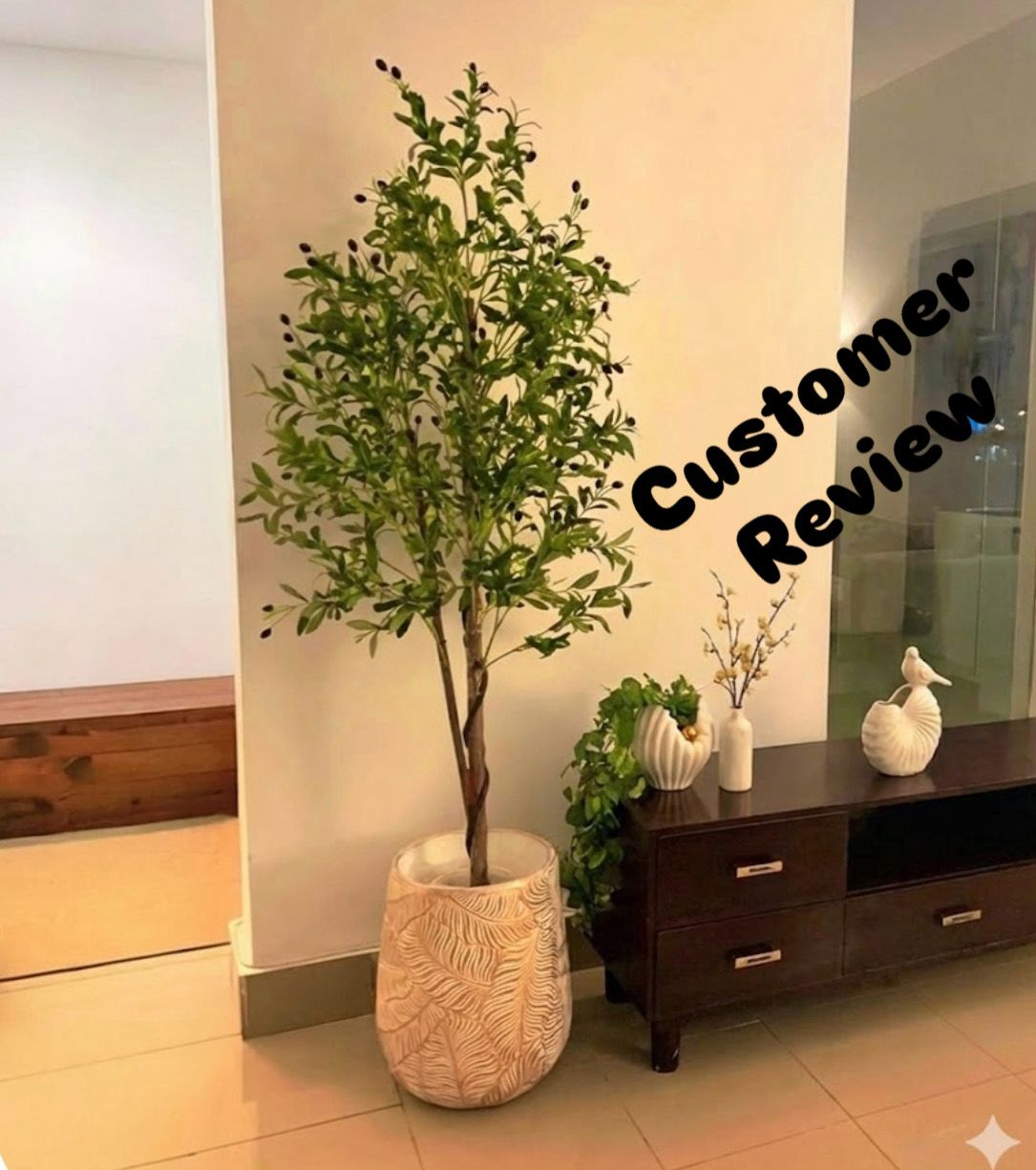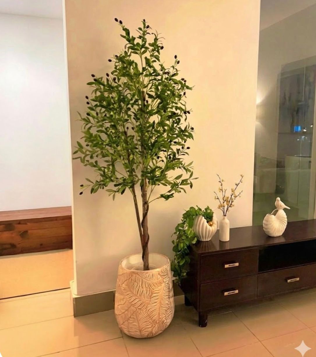 Based on the image, the plant is a decorative indoor Olive Tree (likely artificial, given its perfect symmetry and fruit placement). It is a classic “Shady Lady” or Mediterranean-style accent that has become a staple in modern interior design.