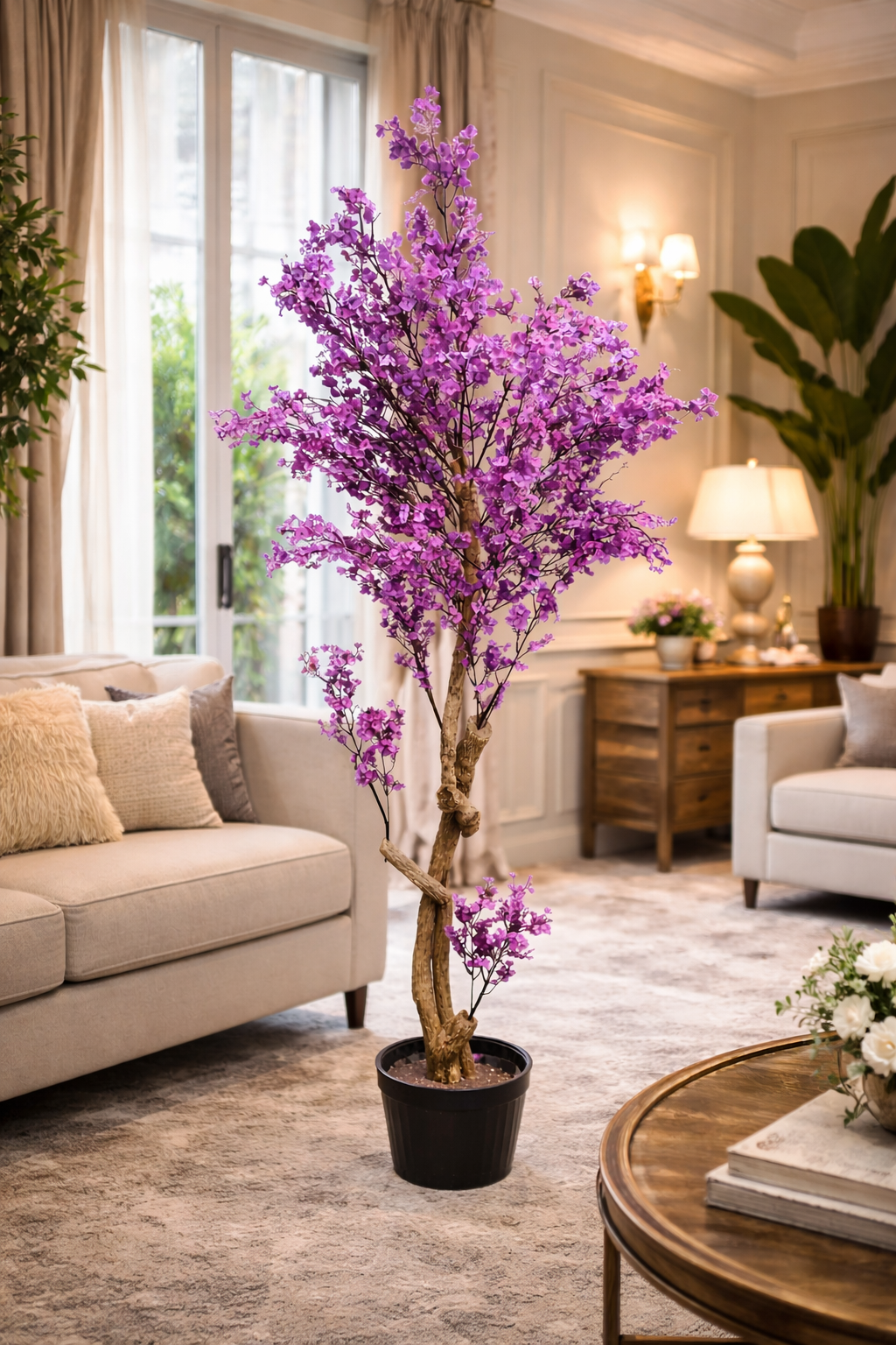 Crafted to mimic the delicate beauty of a flowering cherry or wisteria, this high-quality faux tree combines realistic detail with bold, decorative aesthetics.