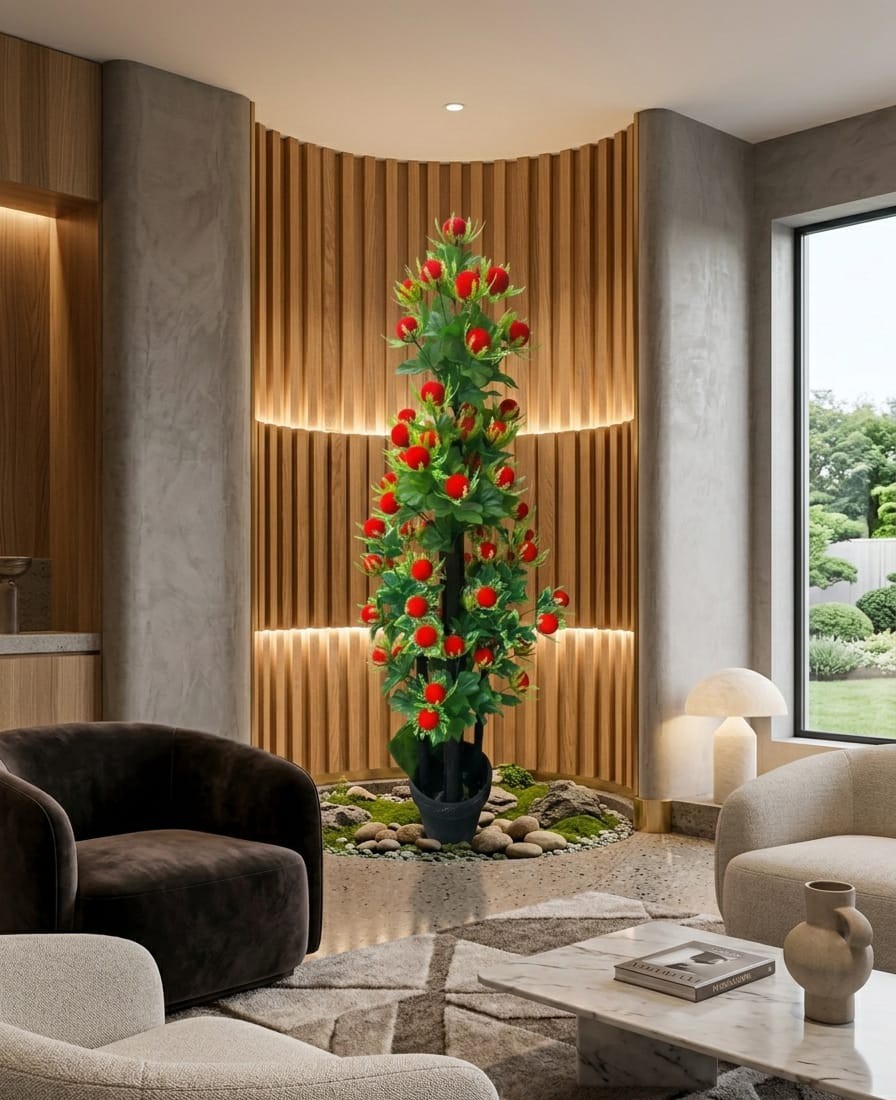 This item is an artificial plant designed for indoor or outdoor decoration, intended to mimic the appearance of real flora without the need for maintenance like watering or sunlight. The plant is tall and dense, with a central dark brown “trunk” structure from which many branches extend. These branches are covered in small, vibrant green leaves. The most striking features are the clusters of bright red, spherical elements that resemble buds or flowers, each with some green, spiky accents around its base. The entire structure appears to be made from durable materials like plastic and potentially iron wire for structural integrity. It is presented in a simple black pot, which is surrounded by decorative, light-colored stones on a wooden-paneled background, suggesting a modern home or office decor item.