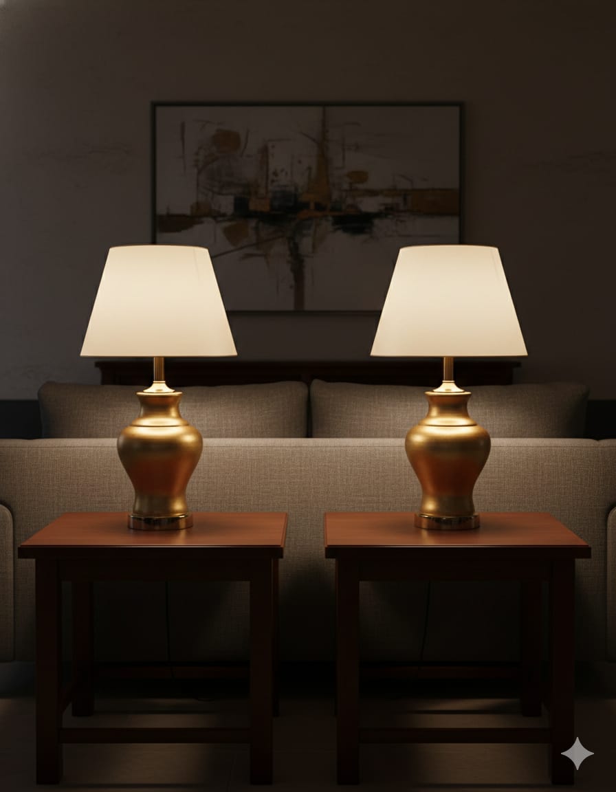 Lighting Atmosphere: The overall room lighting is low, which emphasizes the “hot spots” of light on the lampshades and the reflective sheen on the gold bases. This creates a moody, high-end, and cozy ambiance.