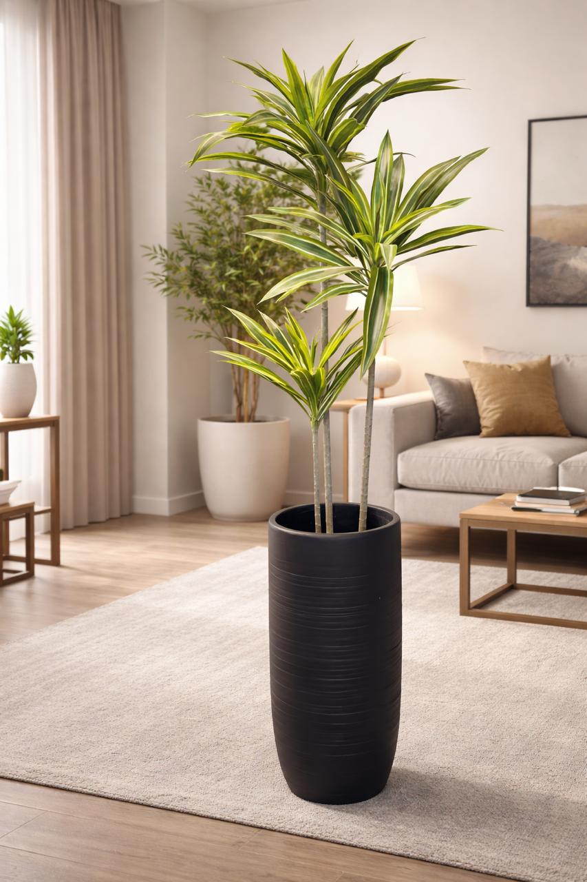 This artificial plant arrangement is designed for high-end interior spaces. The focal point is a multi-stem Dracaena, known for its architectural, sword-like leaves. The foliage features a realistic variegated pattern with deep green centers and bright lime-yellow margins, offering a fresh, lifelike appearance that remains vibrant year-round without the need for sunlight or water.